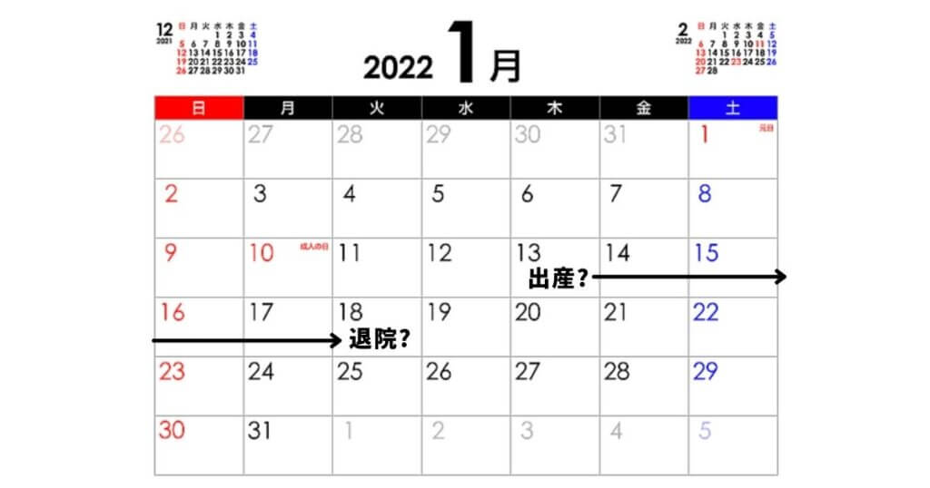 入院期間は人によってさまざまなので、ここでは目安です!初めてのお産の方は分娩当日より5泊6日(産後5日目退院)になるそうです! なので13日ごろかなぁ?って感じですね!
