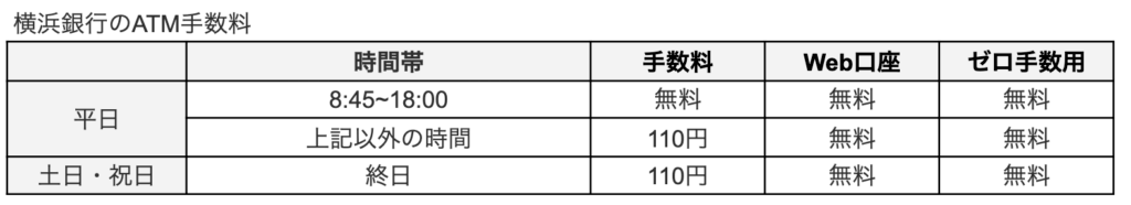 引き出す時の、横浜銀行のATM手数料の一覧です!