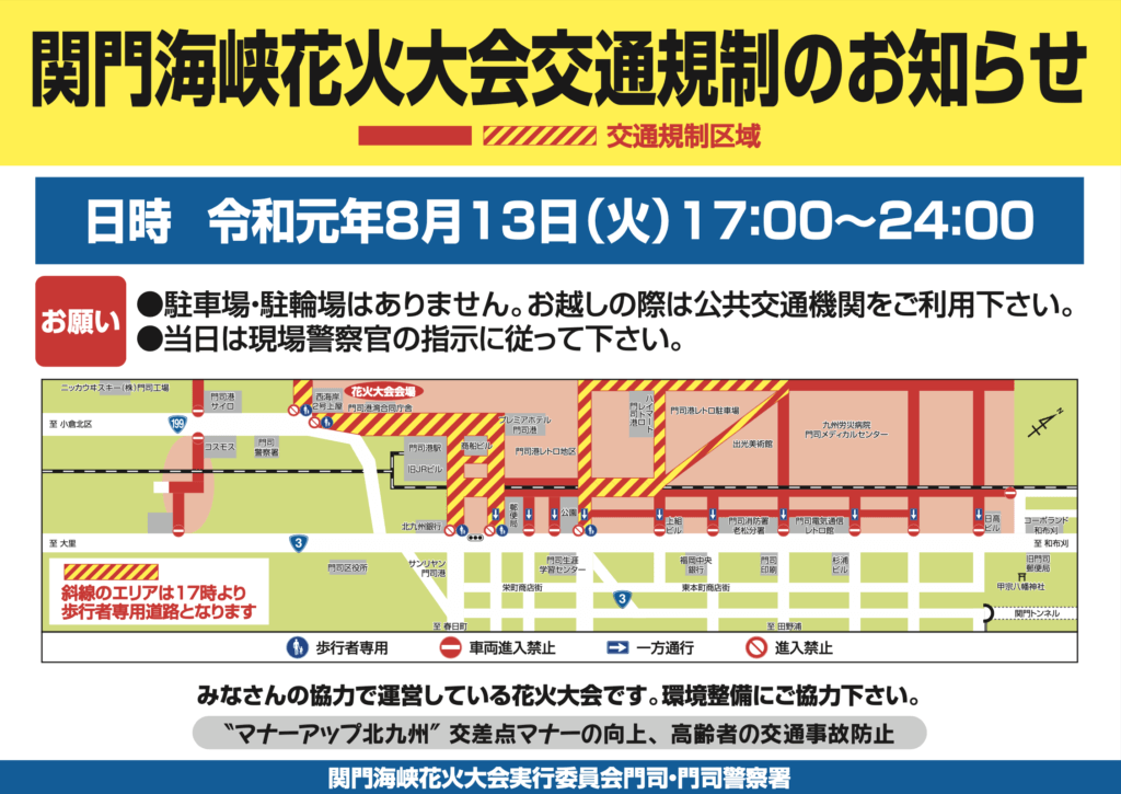 下関側は「はい!からっと横丁」を中心に有料の席が作られ、それに伴い広い範囲で交通規制があります!