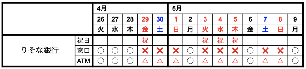 りそな銀行2022年GWの窓口・ATMの営業時間や手数料のまとめ