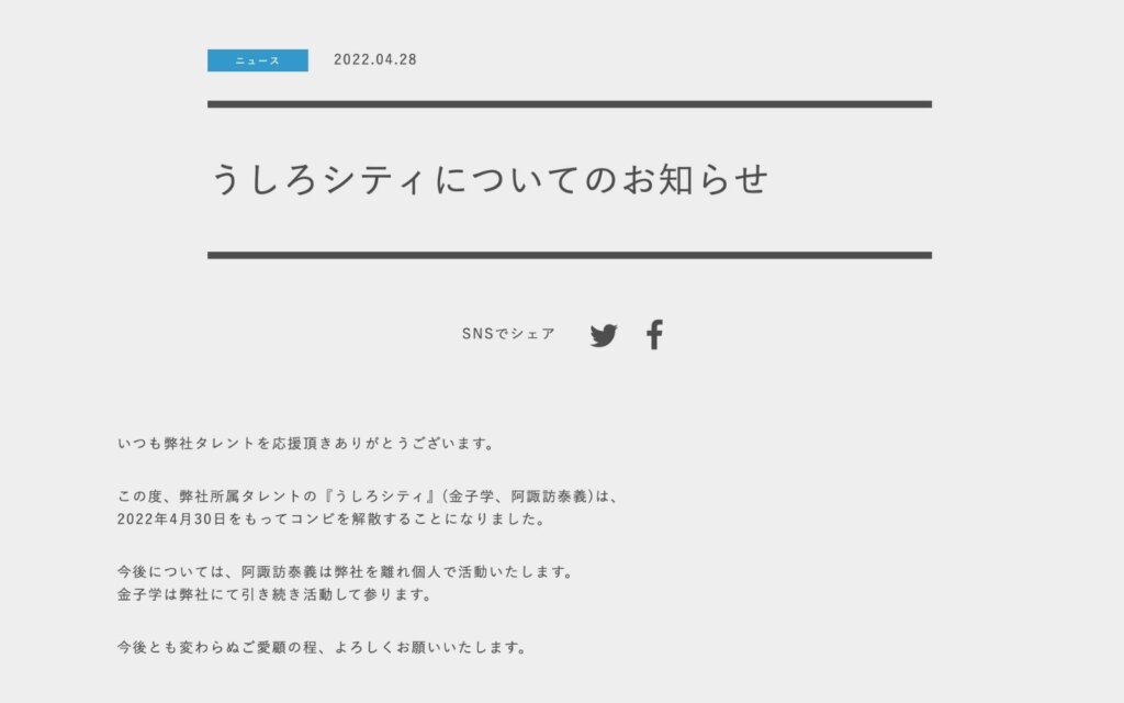 「うしろシティ」が4月30日をもって解散すると、所属事務所の松竹芸能から4月28日に発表がありました!